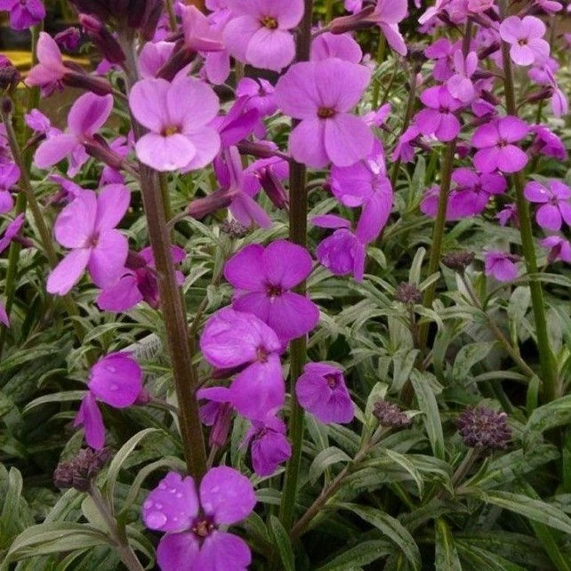 A very reliable and favourite garden plant, this perennial wallflower is evergreen and vigorous and produces neat tidy plants that are covered in flowers over a long period. Purple-Mauve blooms appear in long spires that are carried from late winter to summer, often lasting until the first frosts of winter. These are carried above attractive silvery-grey-green mounds of foliage. It will thrive in a sunny garden border, or even a large patio planter.