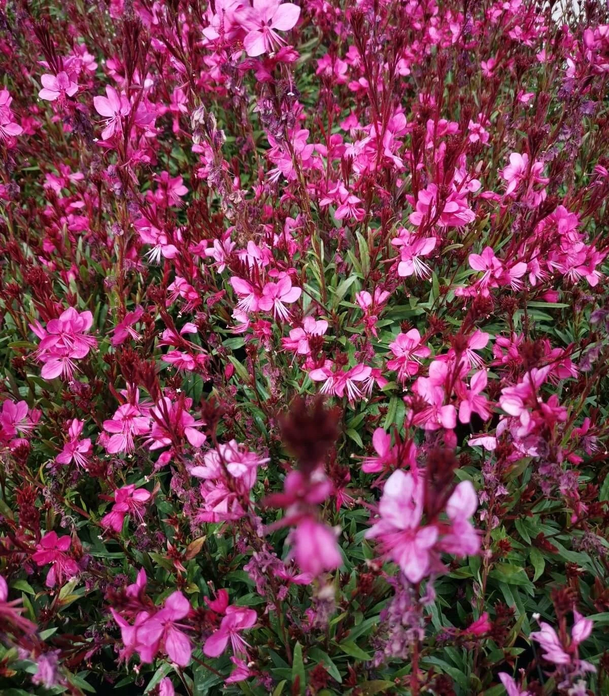 Dark green-purple upright foliage carries spikes of pink flowers through summer in to autumn. Gardeners around the world have loved Gaura for garden borders for many years. Branching, thus producing super bushy plants that then lend themselves perfectly for use in containers. The pink, star-shaped flowers have an airy appearance above the compact growth.