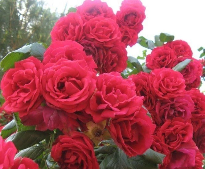 The arching stems of this vigorous, climbing rose are smothered with clusters of cup-shaped, slightly scented, double, bright red flowers in June and July.