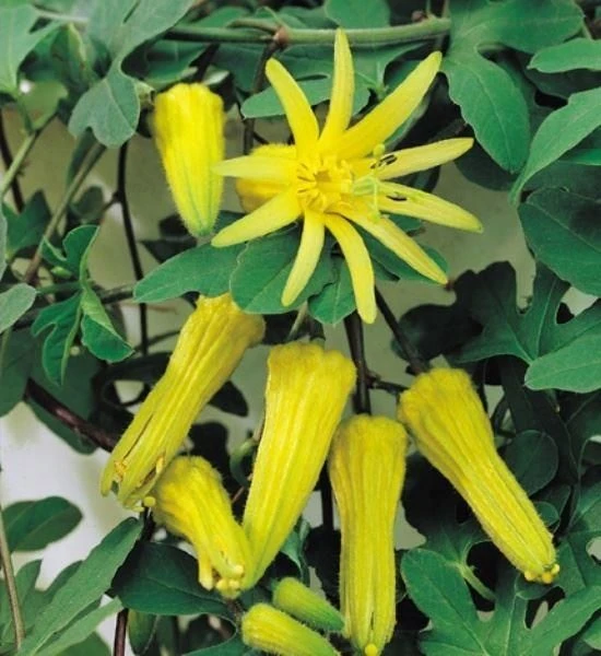 Small vine with starry shaped lemon yellow flowers and felted leaves.